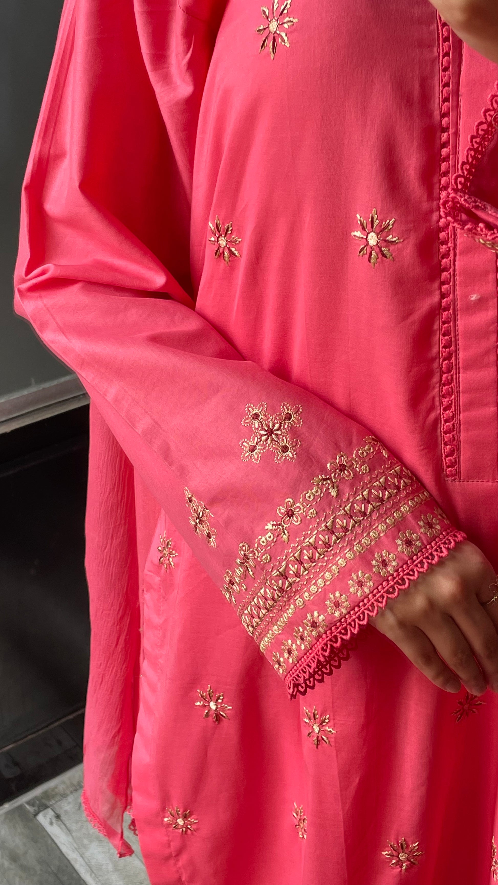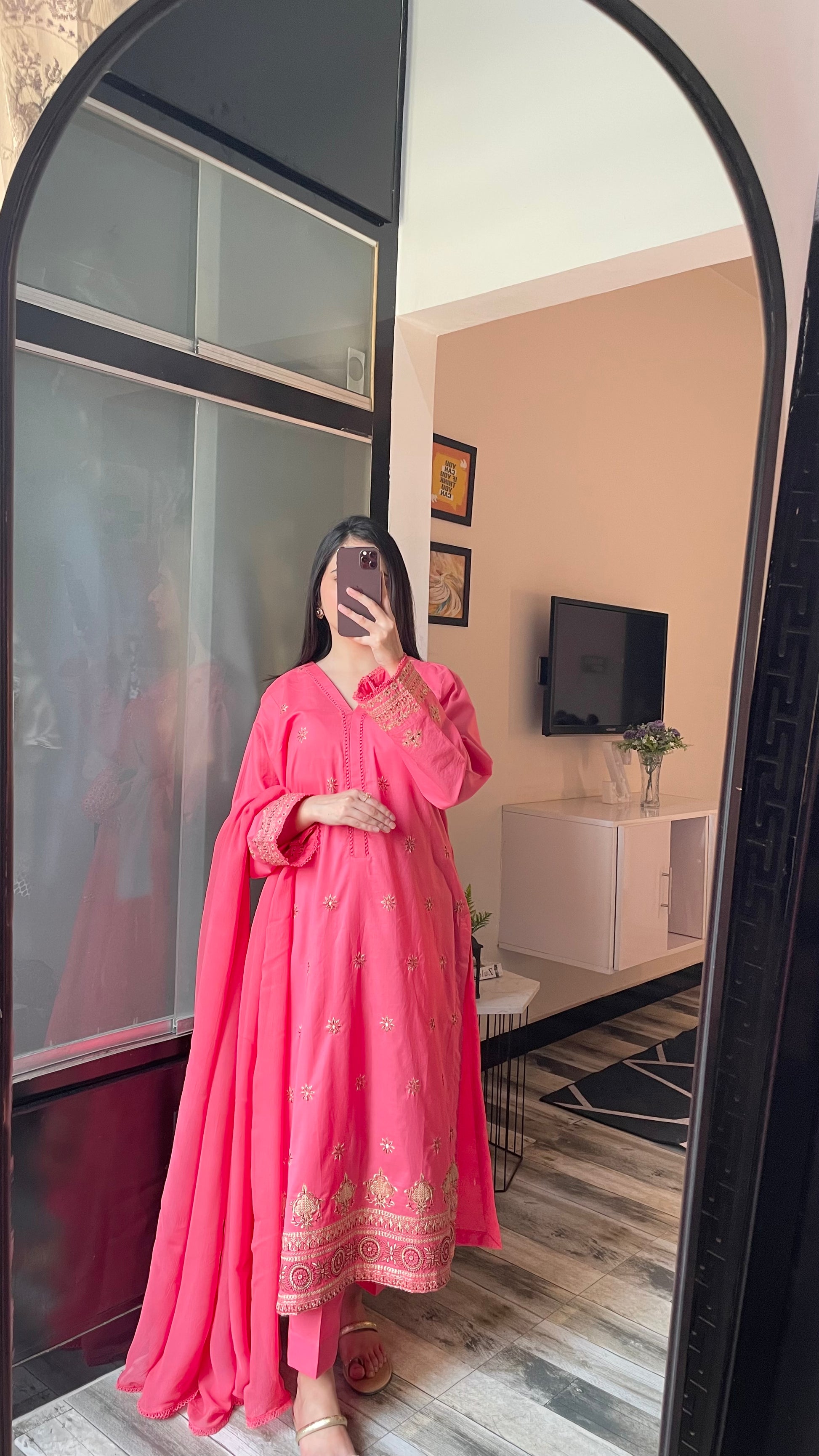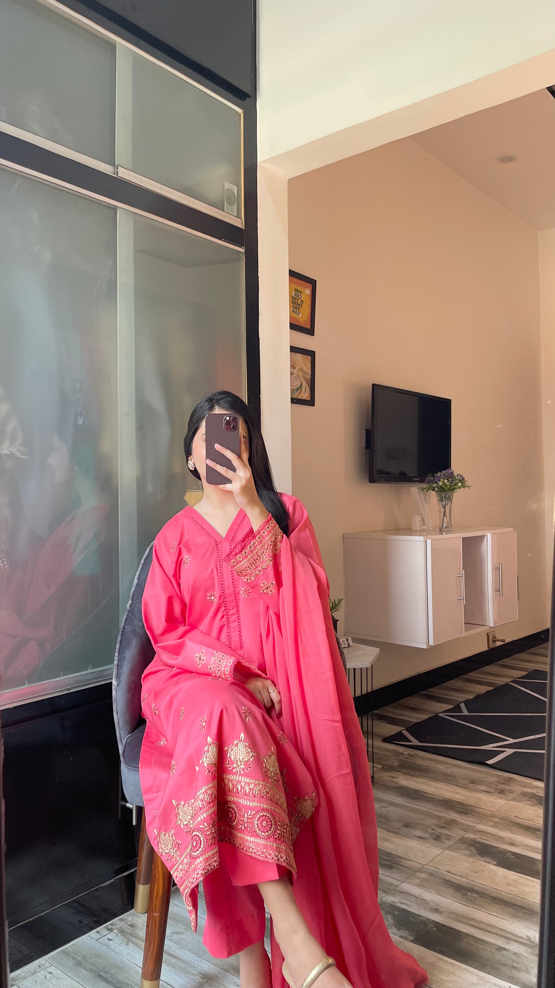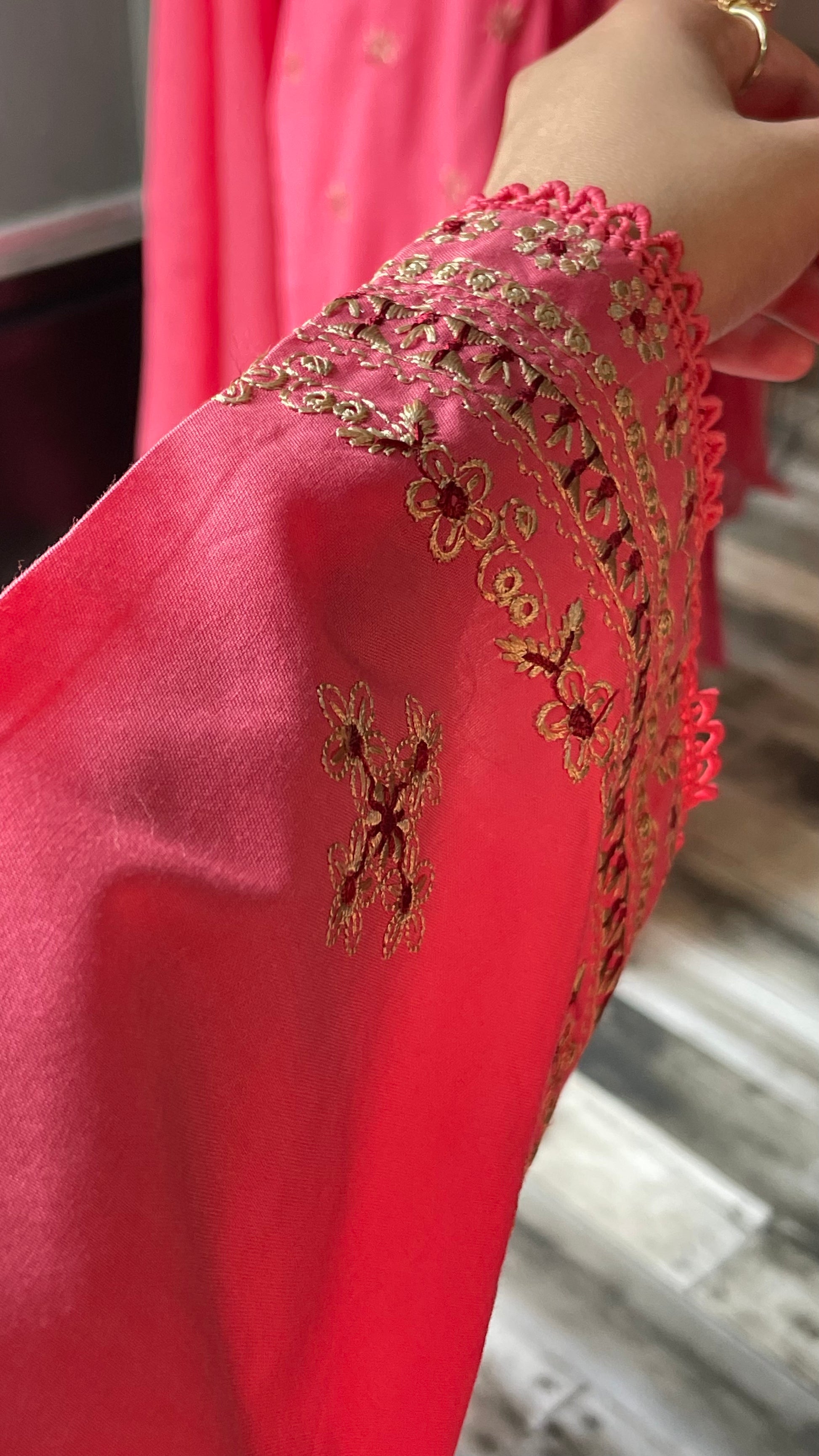 Pink colour long embroidered shirt maroon and off white embroidery on daman and sleeves