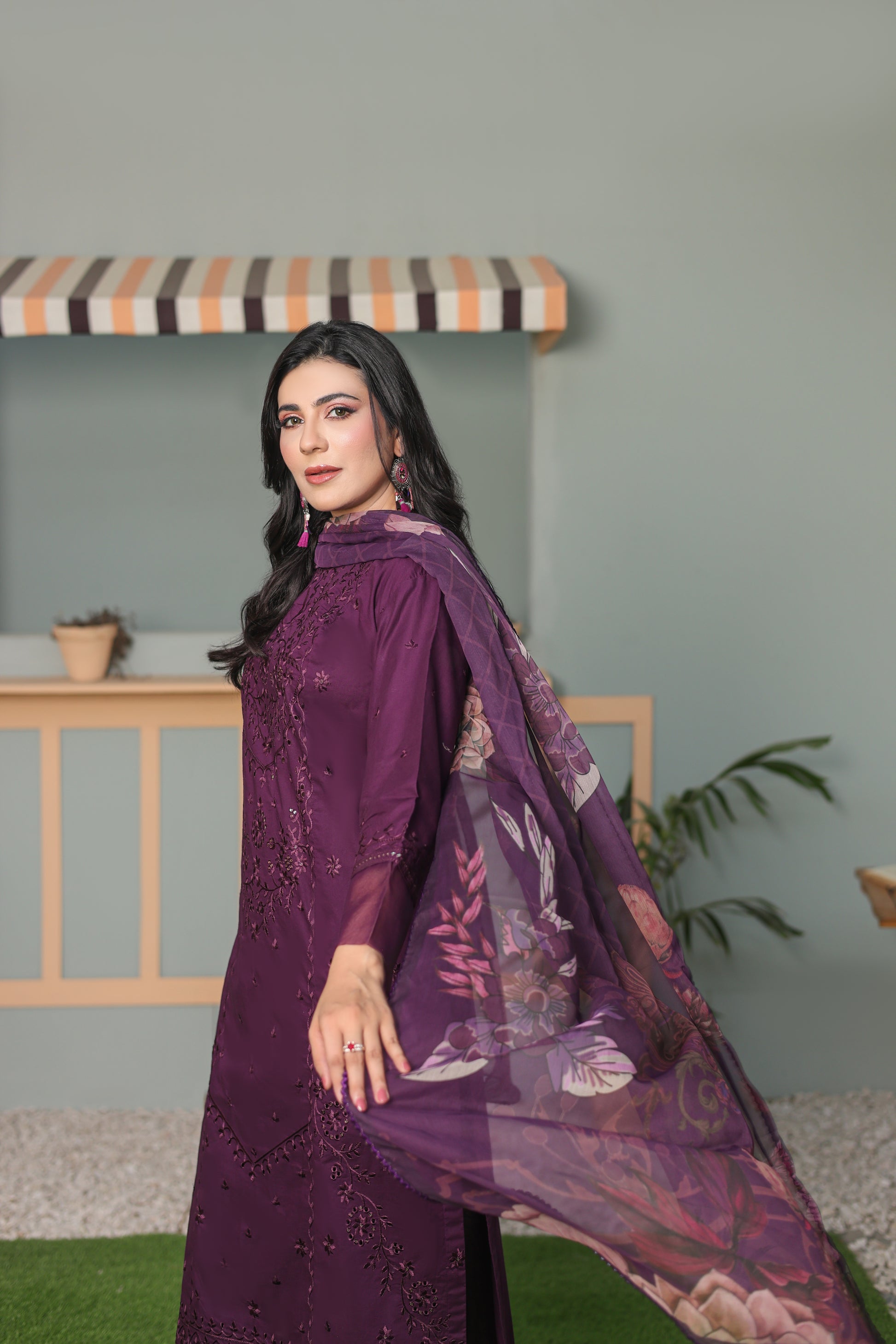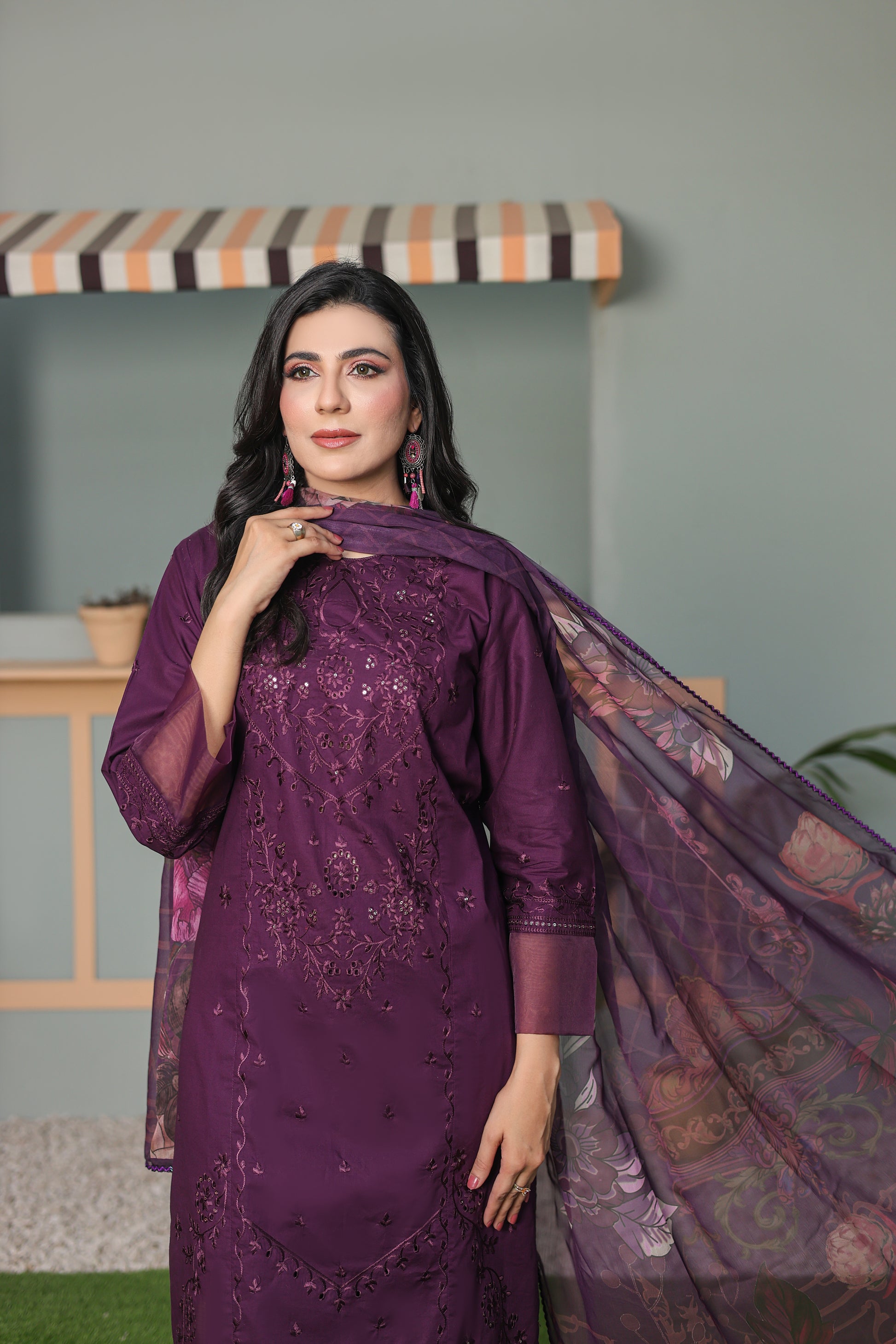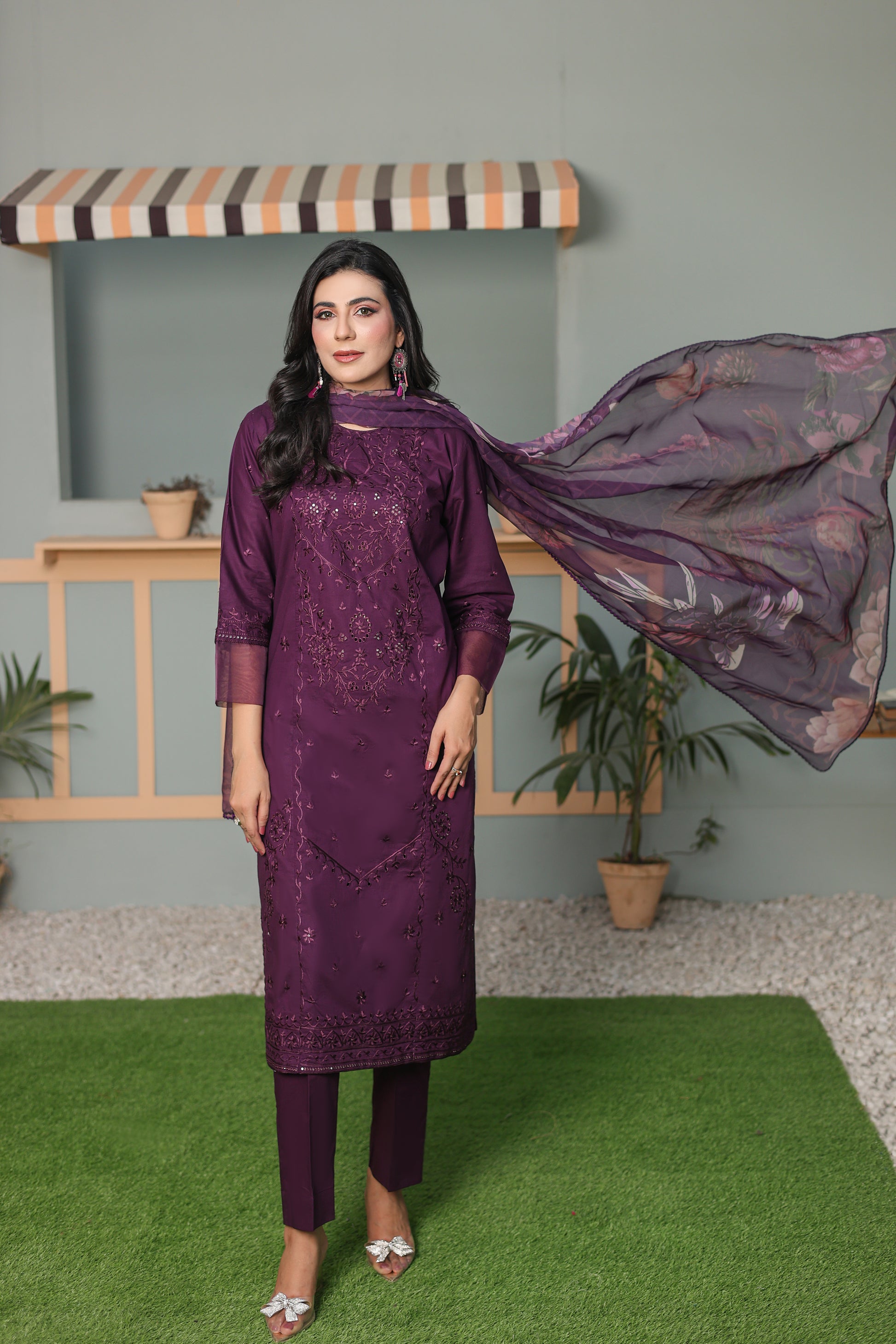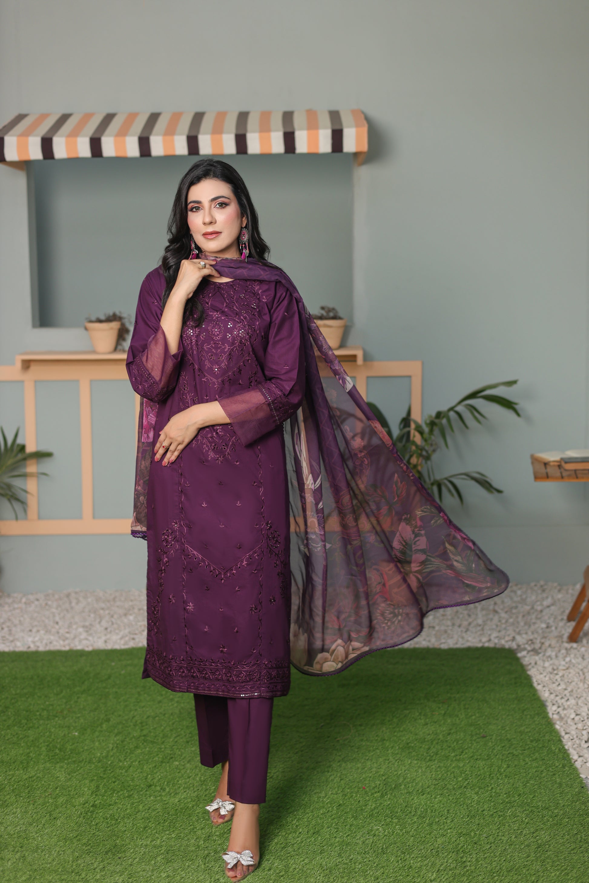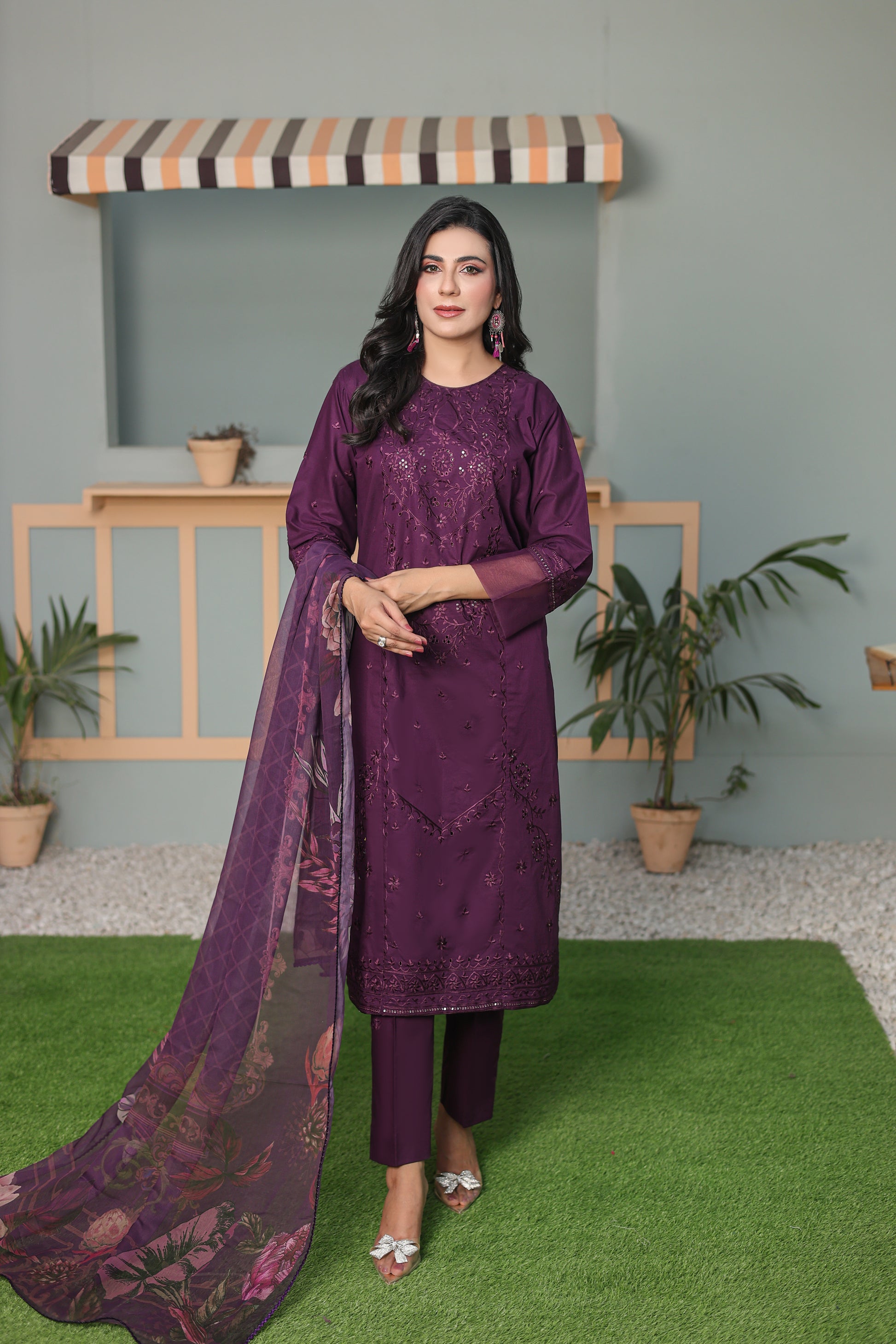 Three piece suit, digital printed dupatta, and purple embroidery sequence.