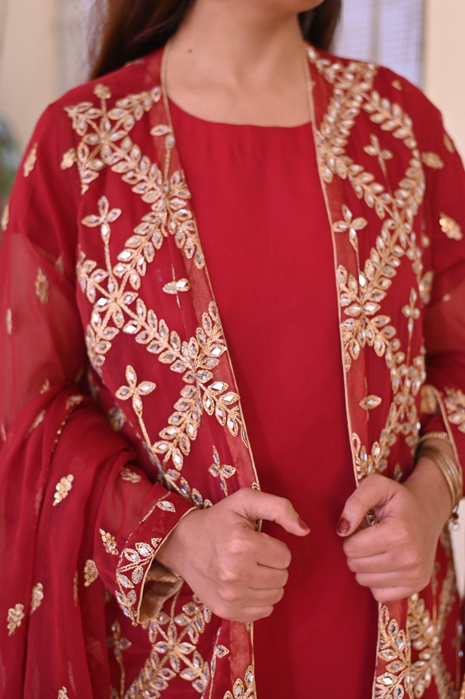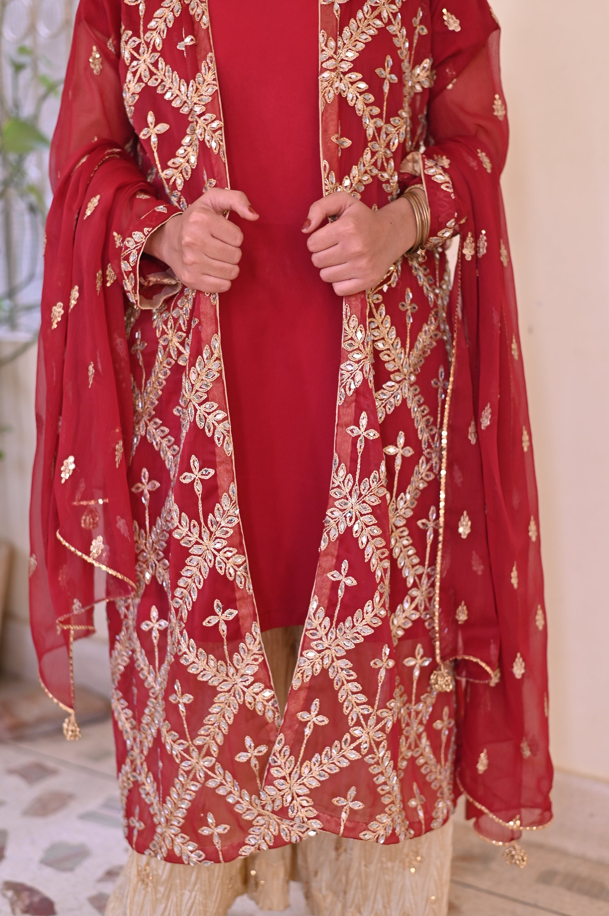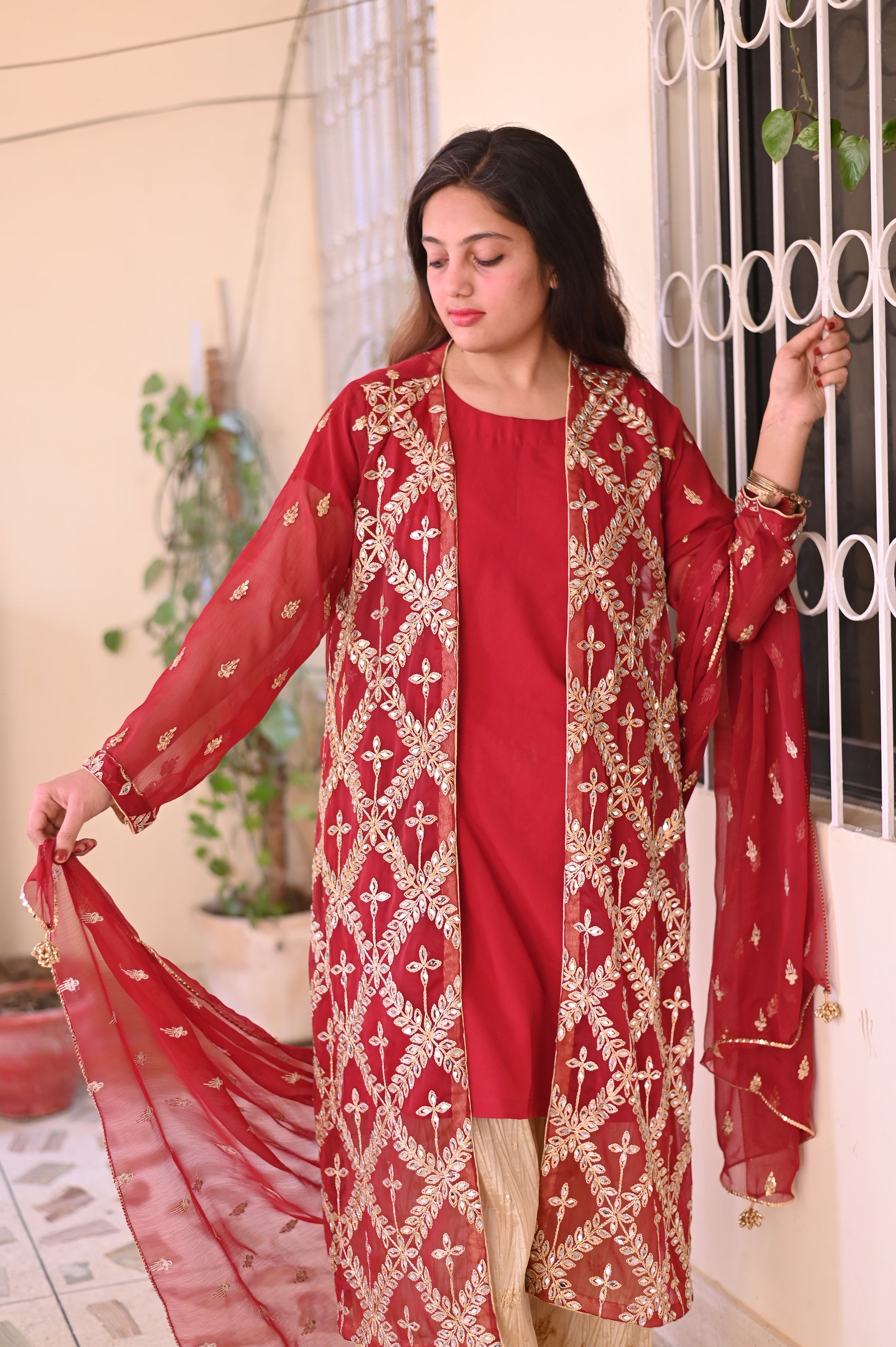 A stunning deep maroon outfit adorned with intricate gold embroidery and mirror work, featuring floral and geometric motifs. Paired with a soft maroon dupatta, this ensemble exudes timeless elegance, perfect for festive occasions and weddings.