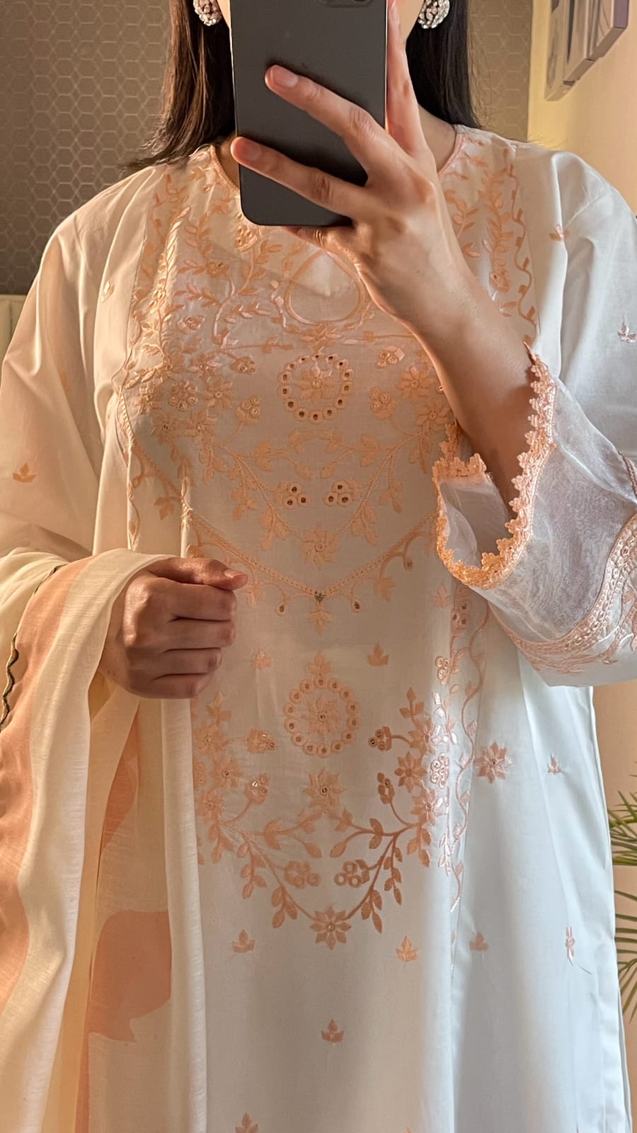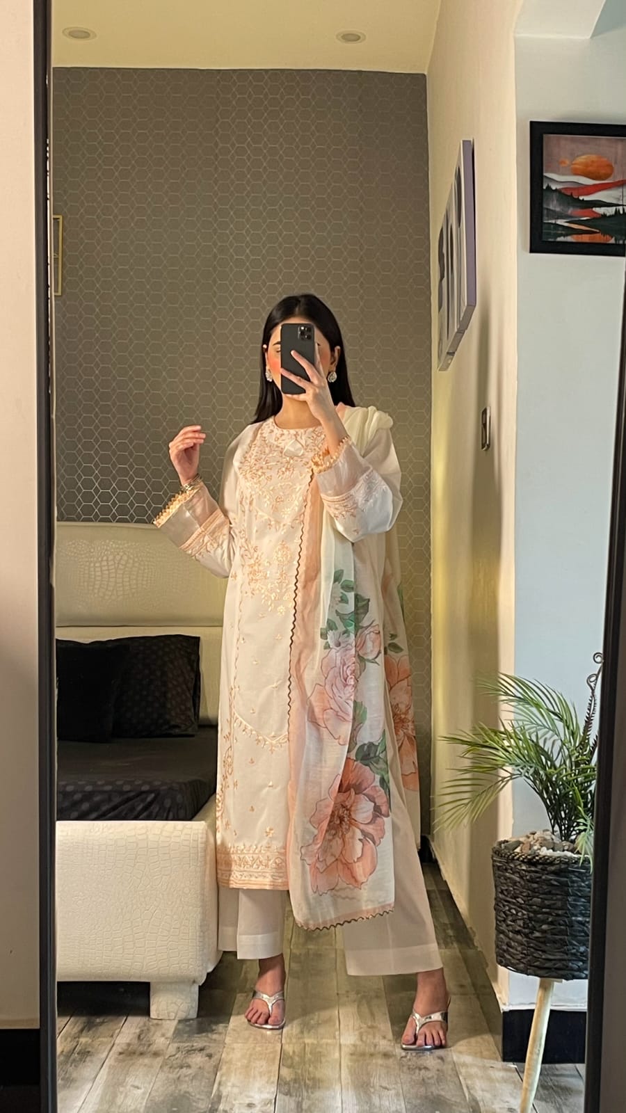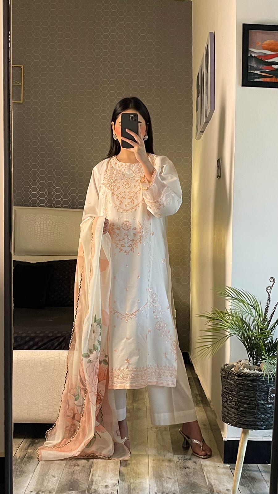 Peach embroidery on off-white base and sequence dupatta monar fabric digital print available in all 3 comfortable sizes
