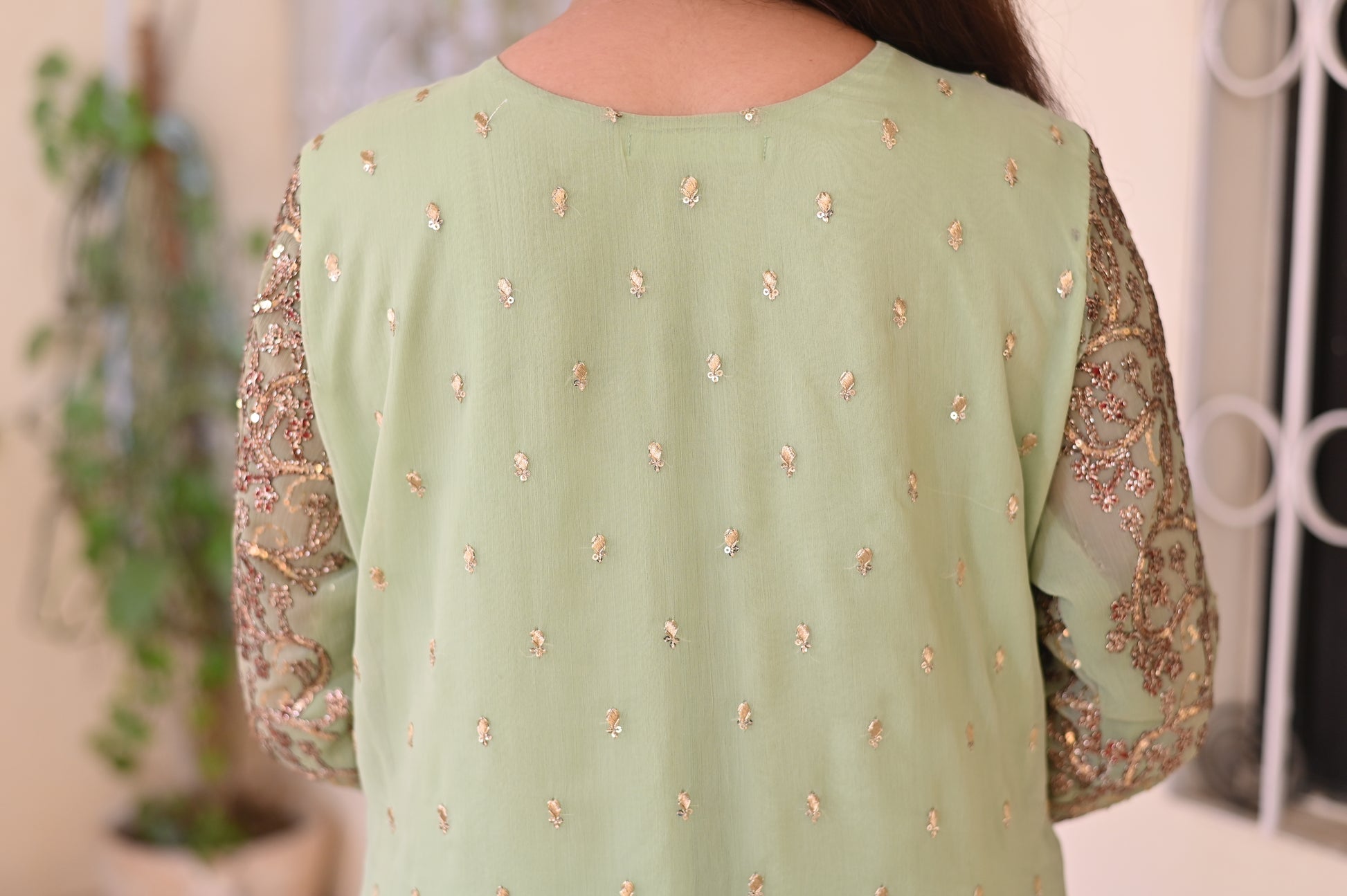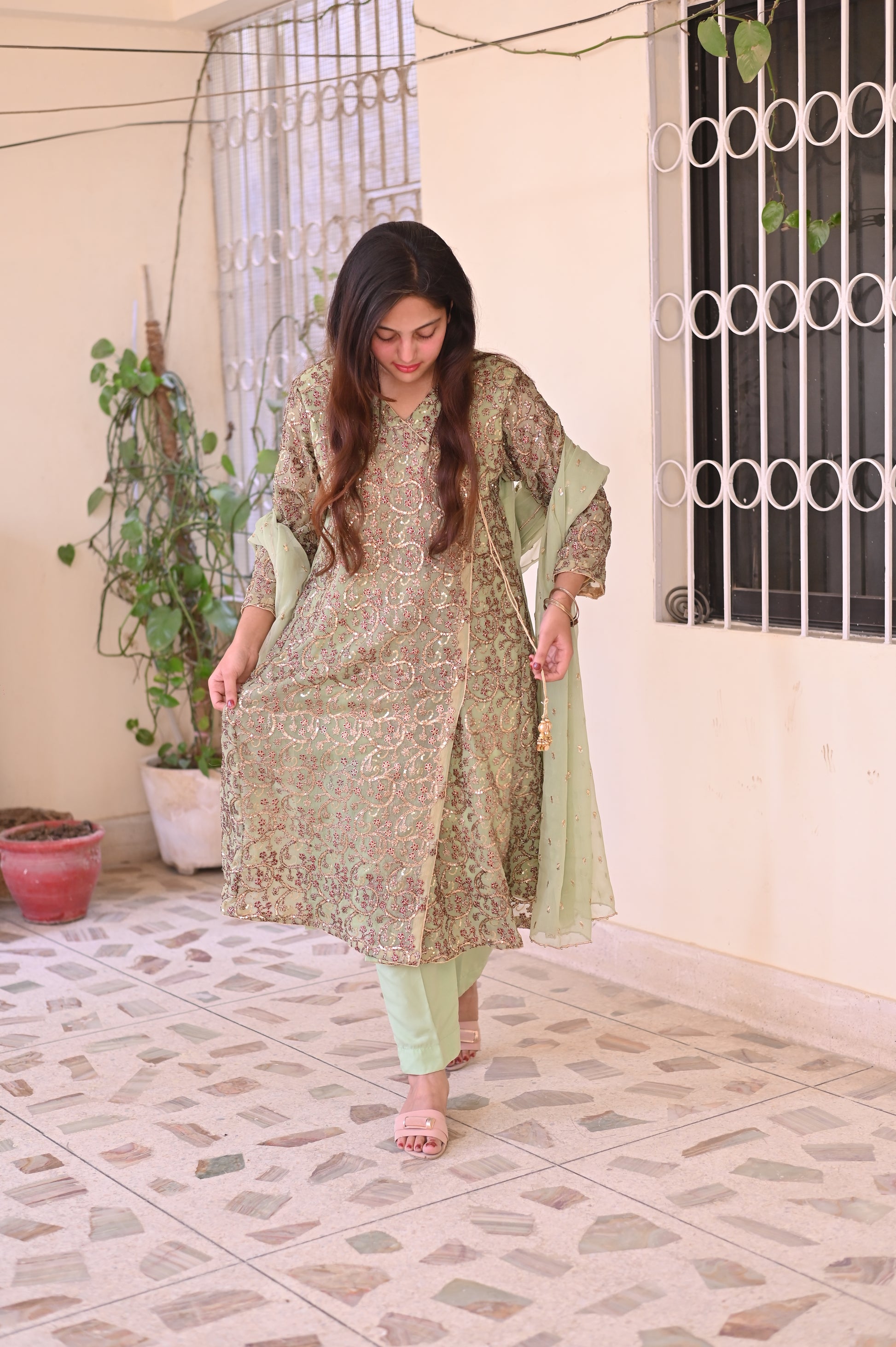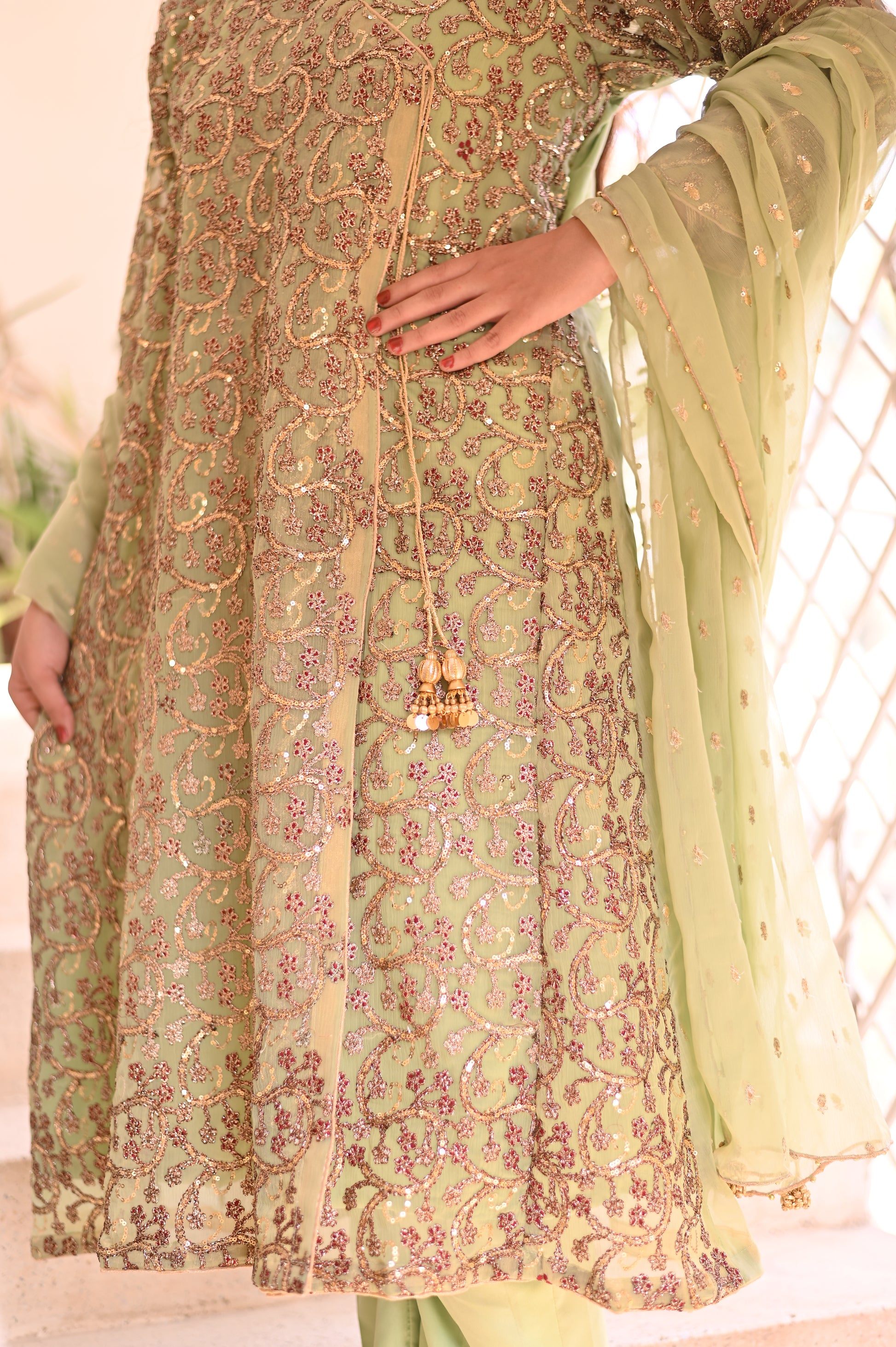 A graceful pastel green outfit featuring exquisite gold and maroon embroidery. Delicate georgette dupatta with golden embellishments adds a touch of sophistication, making it ideal for celebrations or festive gatherings.