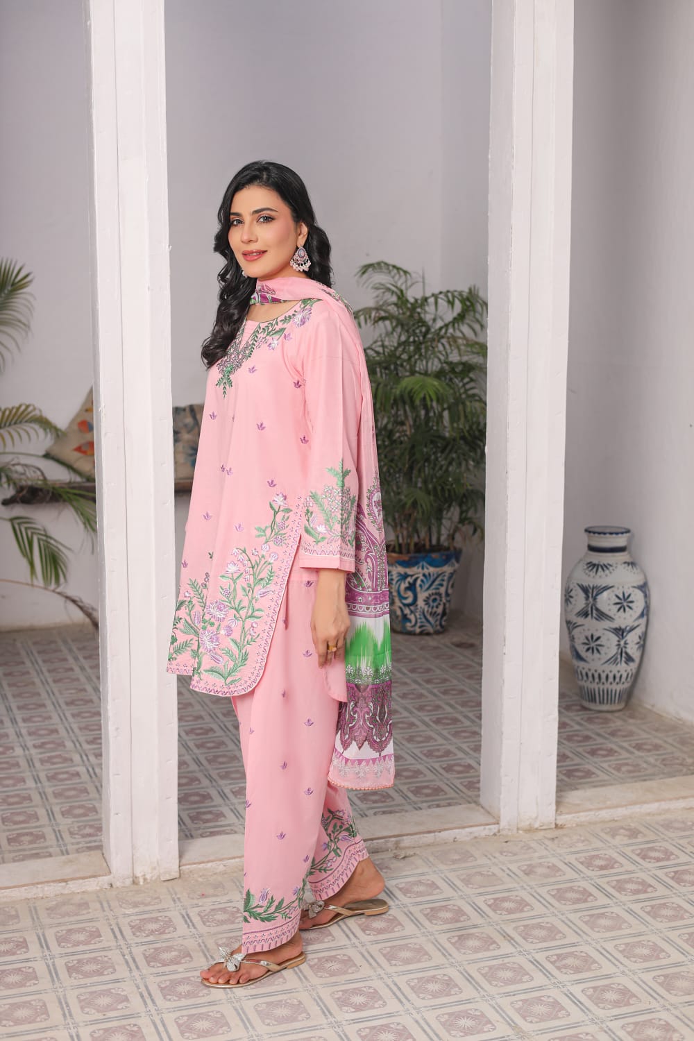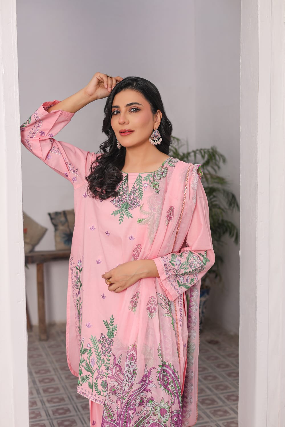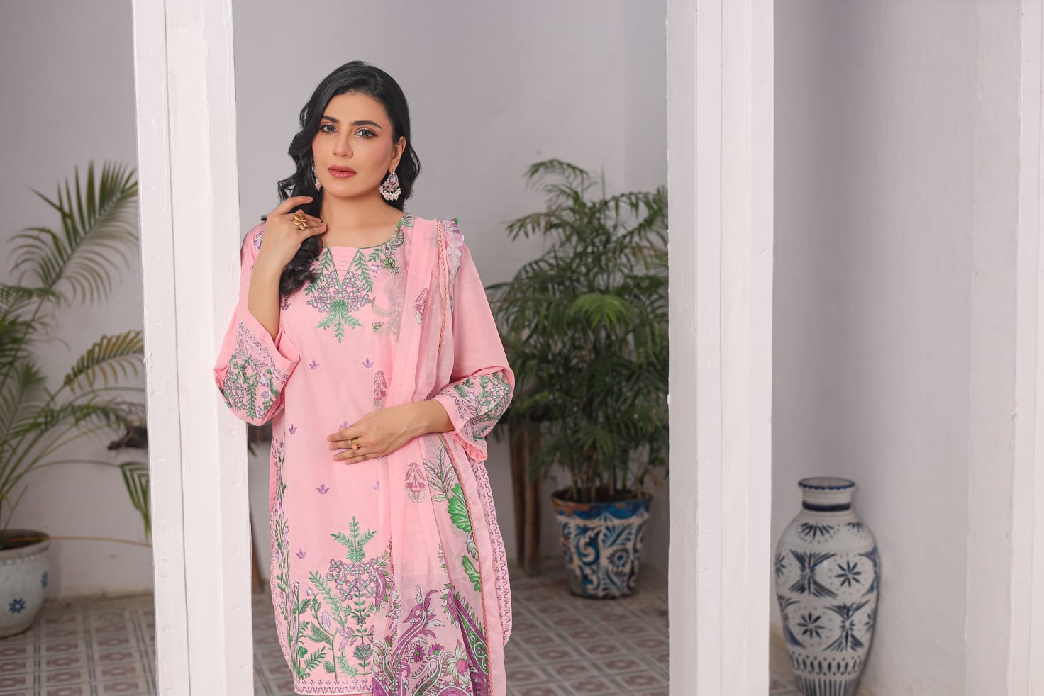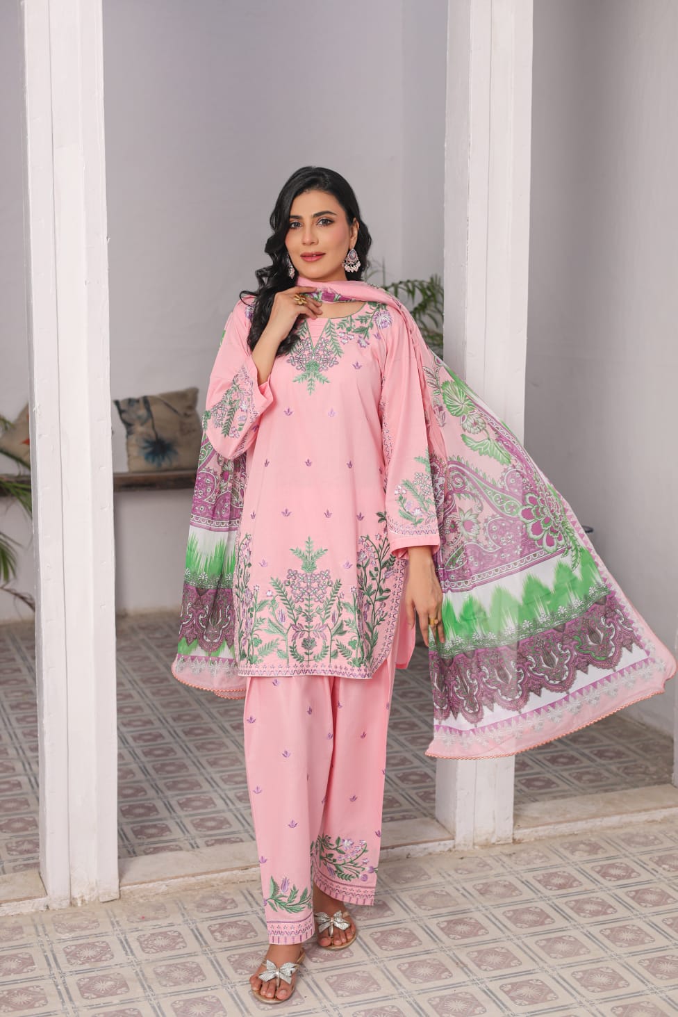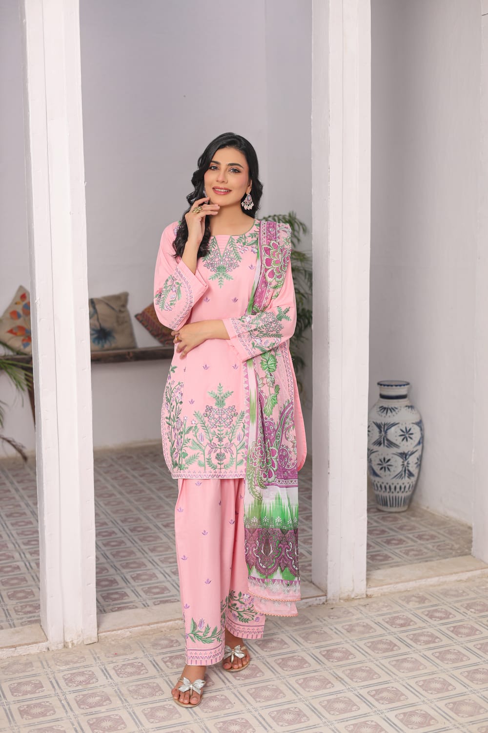 3 piece farshi embroidered shalwar suit with silk digital print dupattas and light pink color with green color embroidery